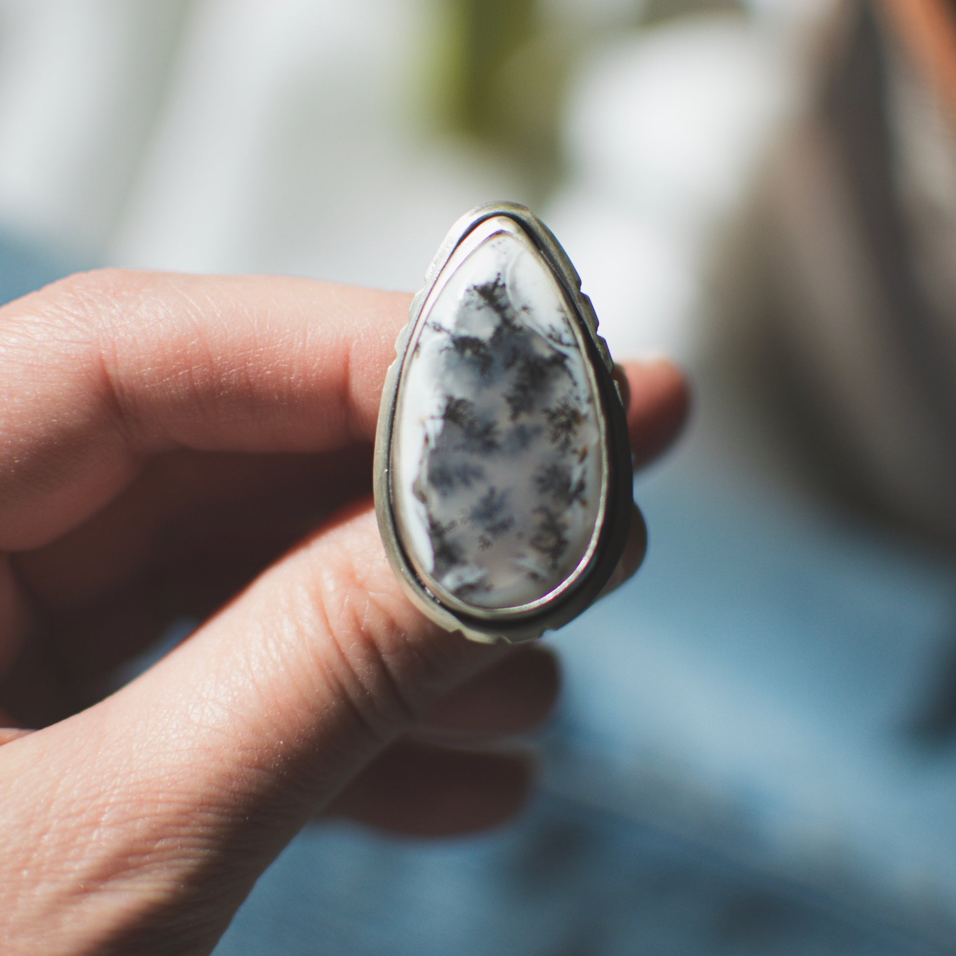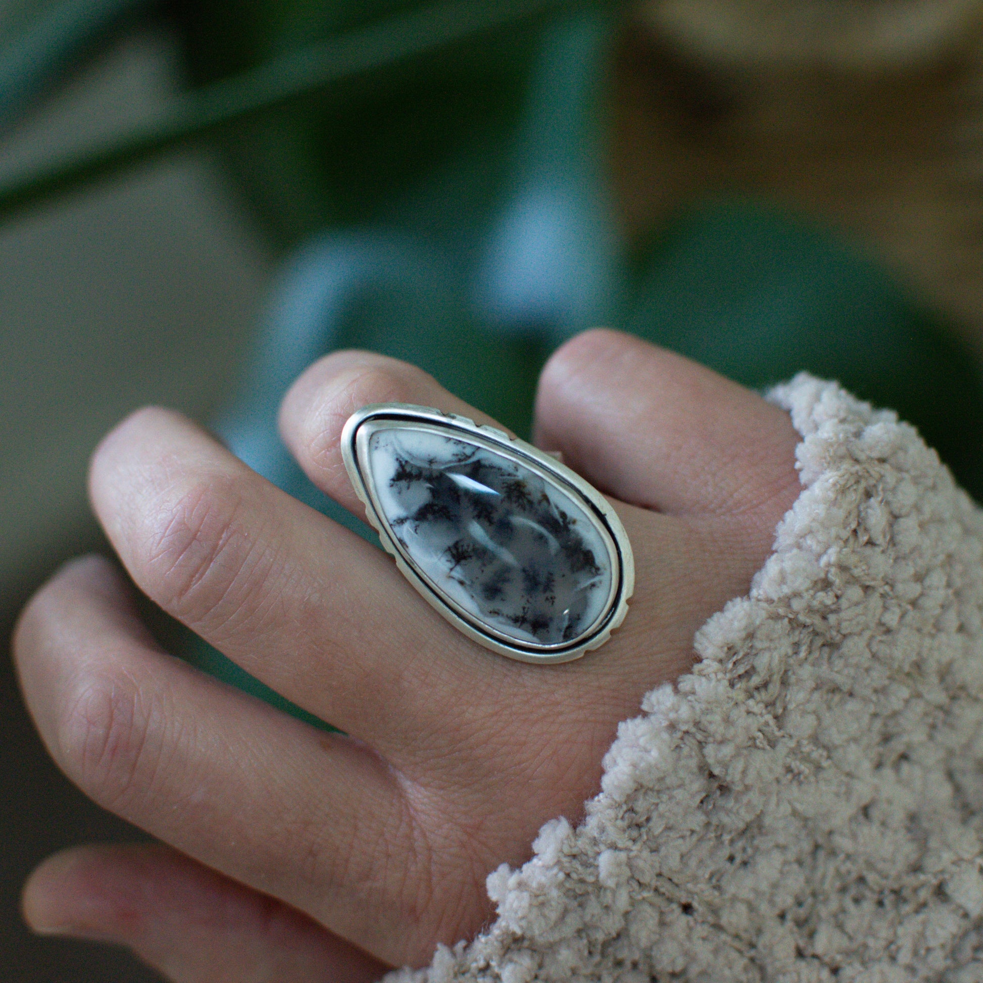 Like a misty little forest scape, this teardrop Dendritic Opal is like a little winter wonderland. Set on a triangular bank in sterling silver with a beautiful matte finish. With a classic black and white coloring this ring can be worn whenever you want to make a statement.
