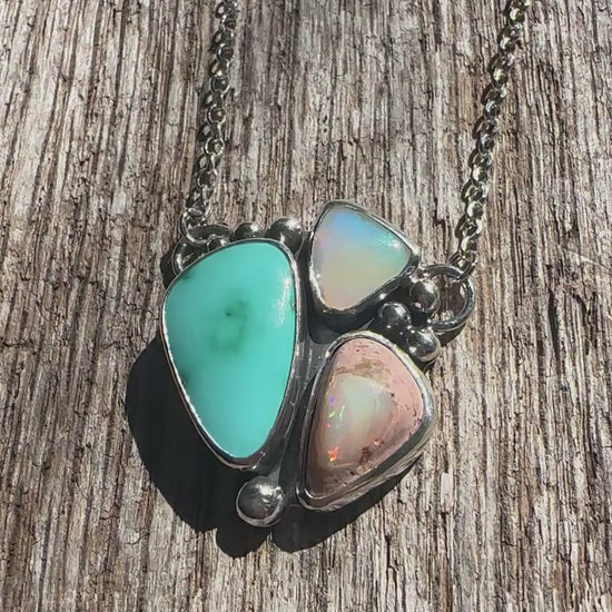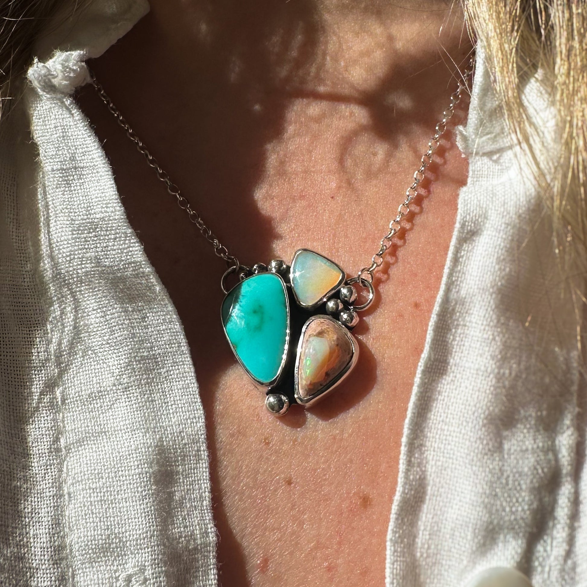 Open sky meets dessert fire in this turquoise and opal combination. A juicy blue Royston Turquoise pairs up with an Australian pipr crystal opal and a Mexican cantera opal. The organic arrangement captures the contrast of cool desert skies and warm firelight - an earthy statement piece designed to shine in the light. Pairs perfectly with a simple silver layering chain or the Organic Token Necklace.