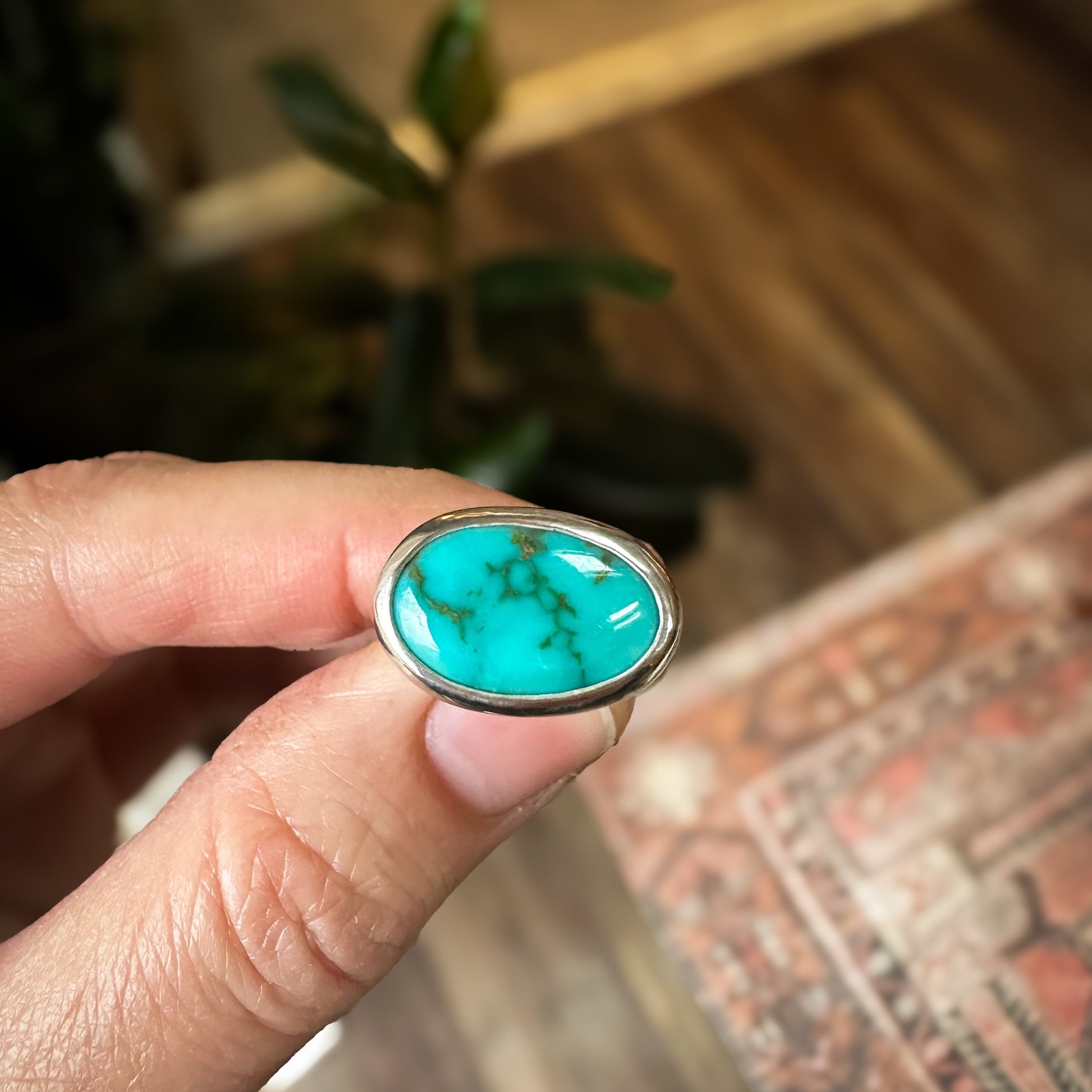 An every day ring with a creamy deep turquoise set in fine silver with a sterling silver double ring shank.