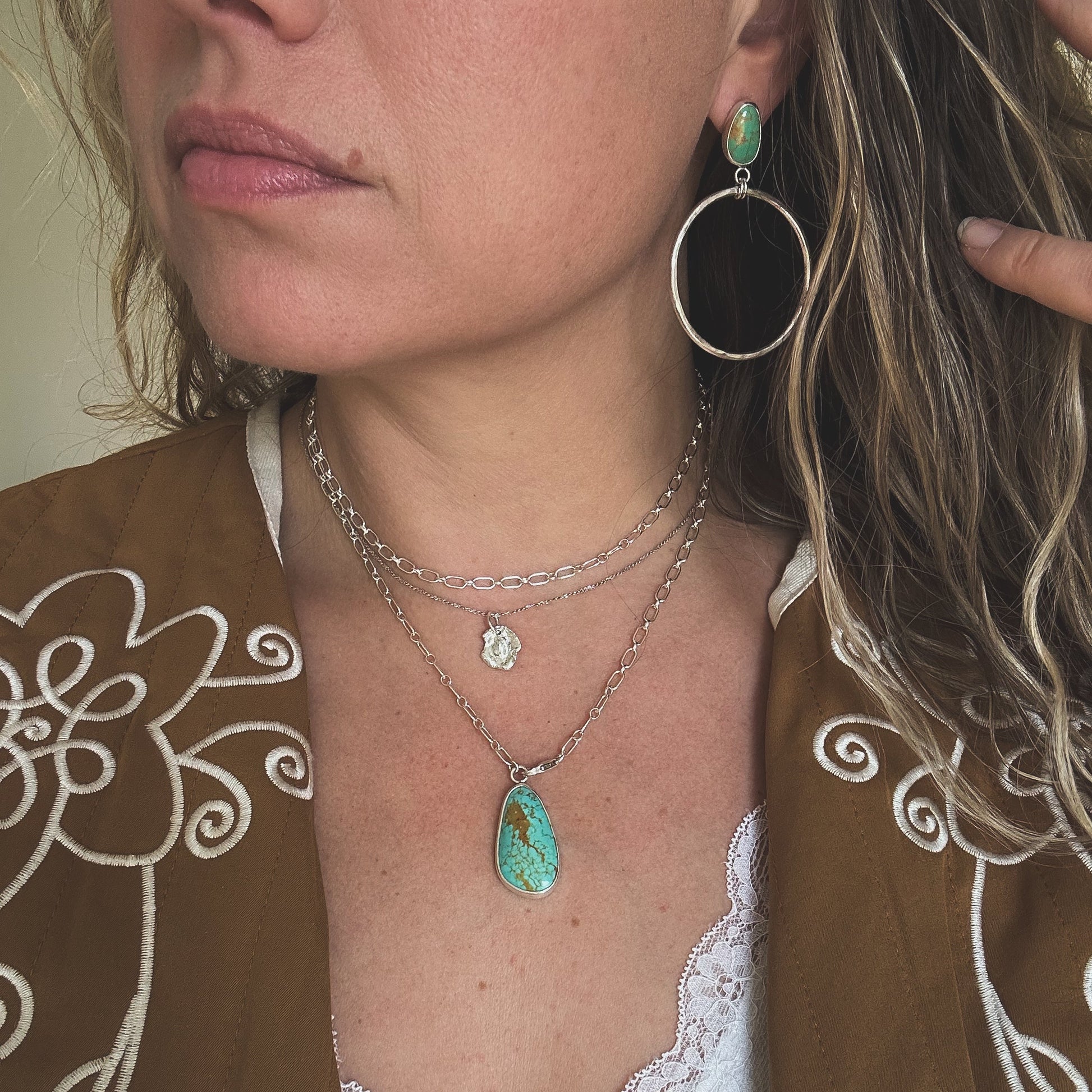 A Kingman turquoise pendant necklace set in sterling silver and finished on a long, lightweight chain designed to wear two ways—styled long or wrapped twice for a layered look. Lobster clasps in front to the top of the Pendant.