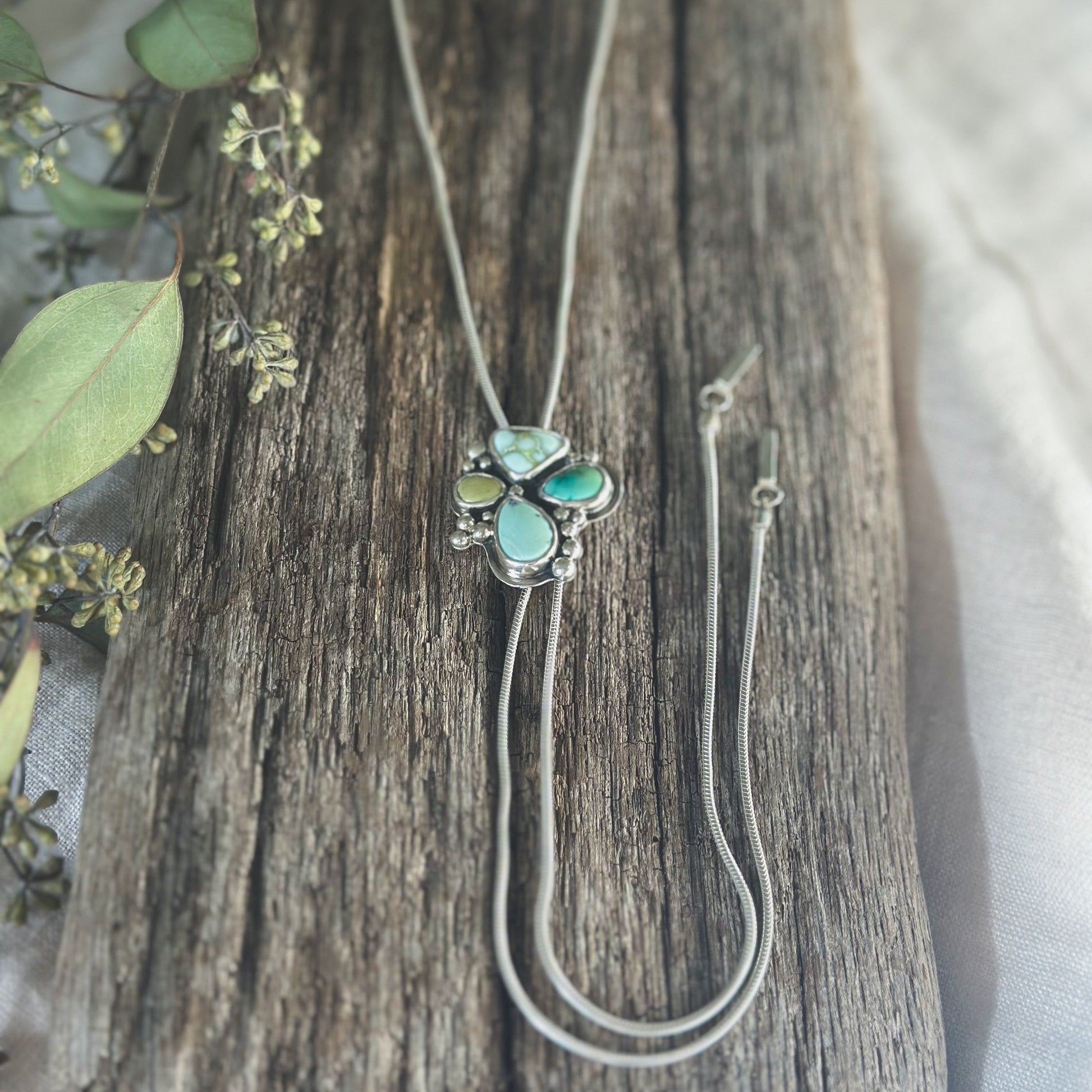 A beautiful mix of turquoise come together to create this adjustable modern Bolo. Set on a sterling silver snake chain. Perfect on its own or endless ways to layer.