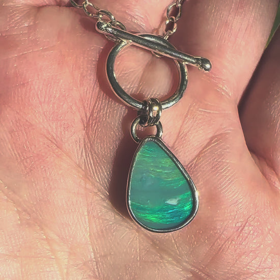 A teardrop opal pendant set in sterling silver and paired with a modern toggle closure. This necklace glows with shifting green and blue tones, adding a lightweight, coastal-inspired statement perfect for everyday wear, layering, and lovers of opal jewelry and artisan-made designs.