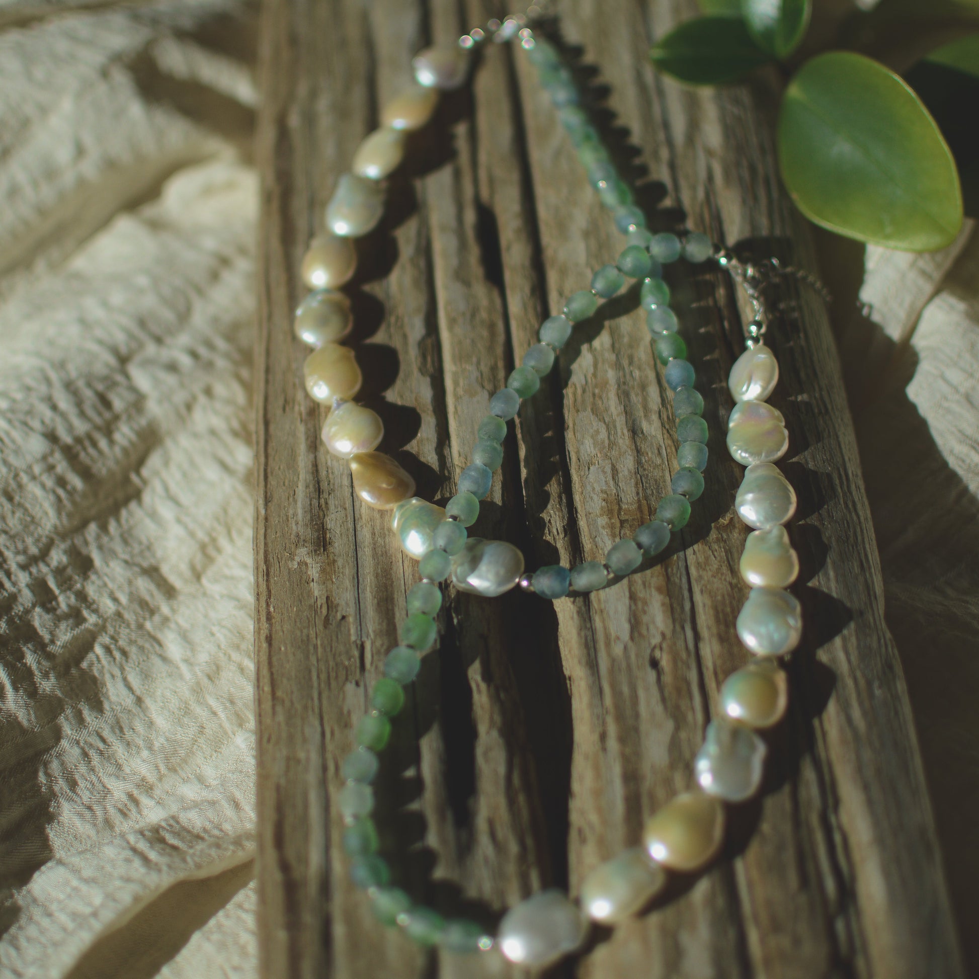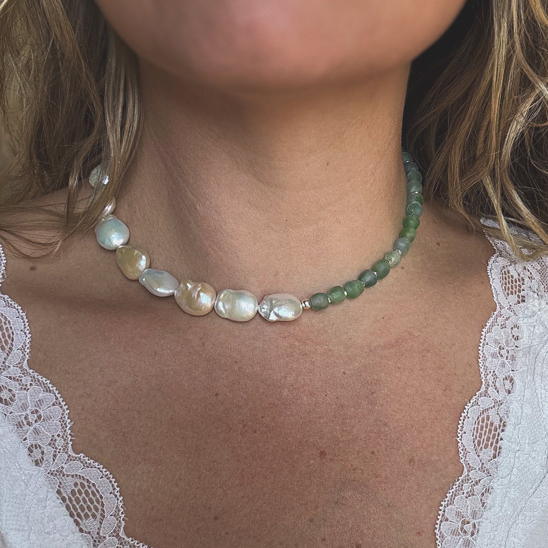 Gorgeous freshwater peals paired with soft sea-green recycled glass beads. Sterling Silver accents and clasp. Earthy, elegant, and full of coastal texture, this piece blends classic pearls with modern, sustainable materials for a fresh everyday statement. Beautiful on it's own or layered with a silver chain.