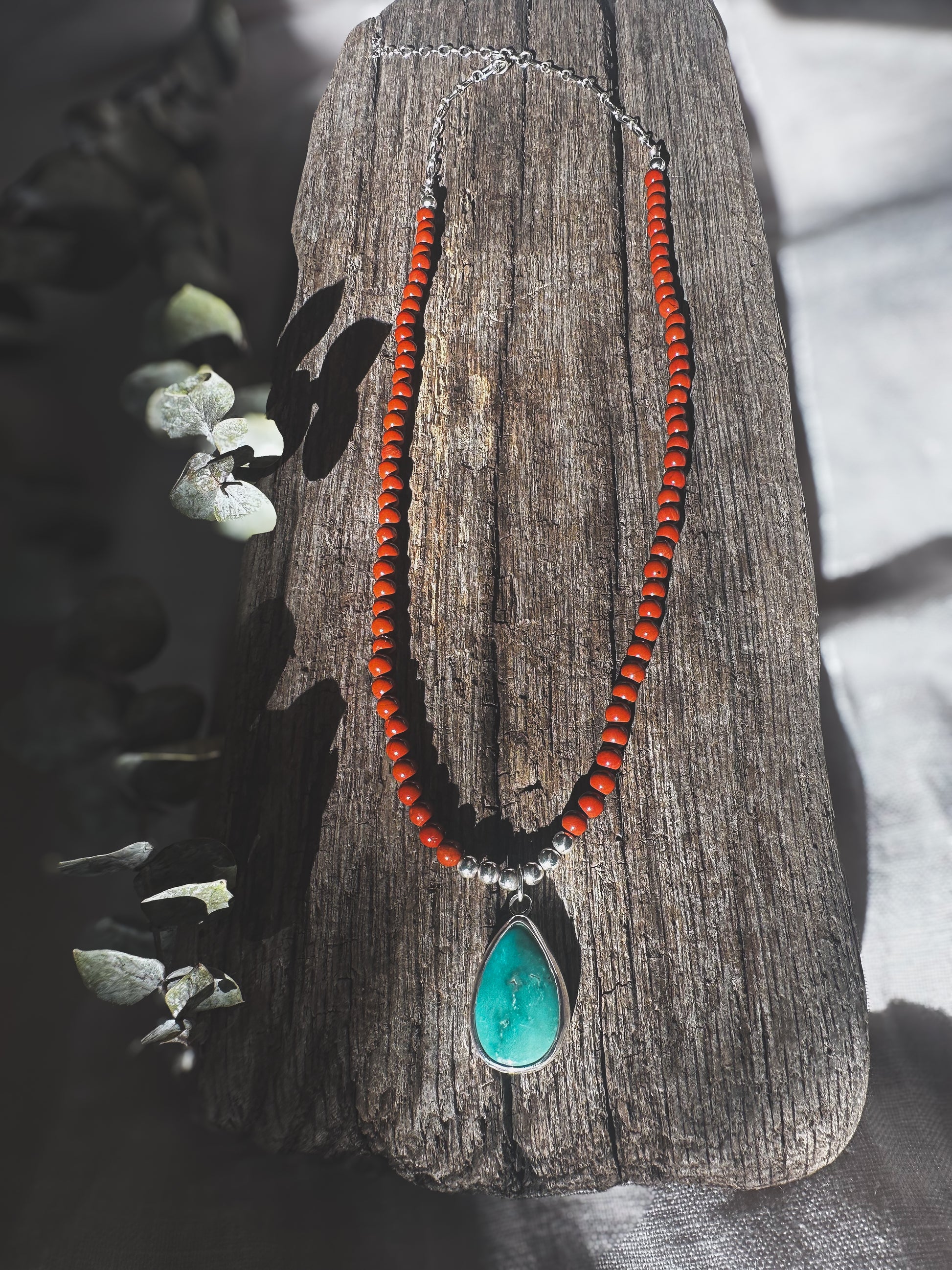 A red jasper beaded necklace accented with sterling silver and finished with a sterling chain for adjustable length. At the center hangs a teardrop Cloud Chaser turquoise pendant, rich with blue-green depth and natural matrix. Bold, earthy, and full of contrast.
