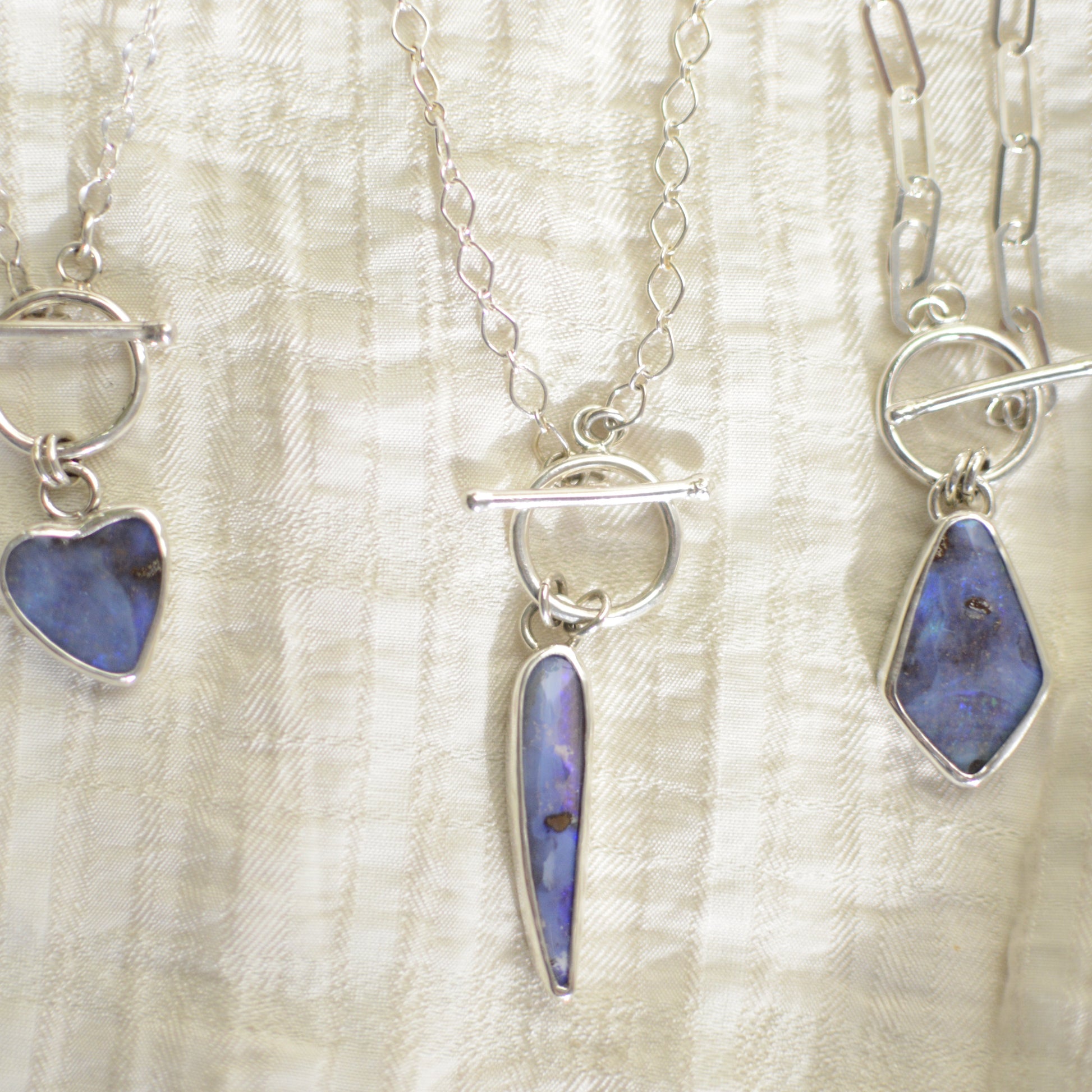 A simple spiked Australian Boulder opal in hues of violet set in fine silver and hangs from a sterling silver chain. Classic toggle closure.