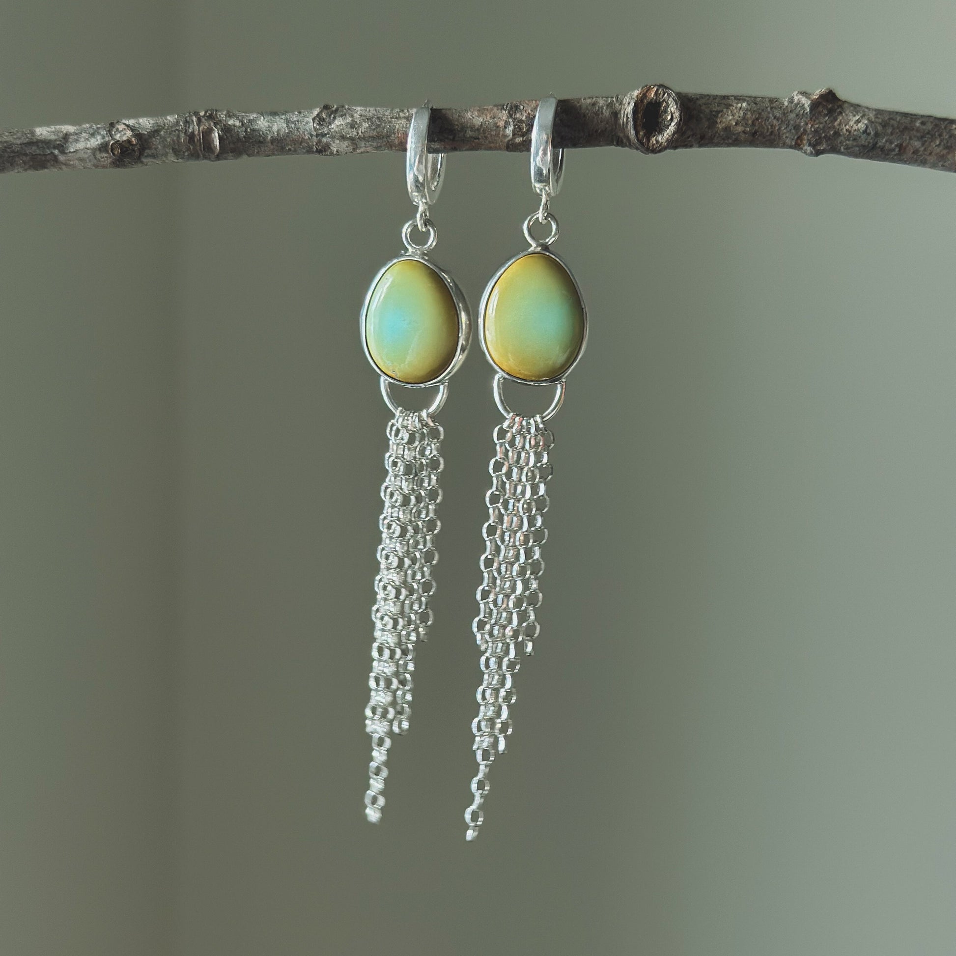 Soft pale aqua with a mist of olive green around the edges of these beautiful Lone Mountain Turquoise. These are lightweight with beautiful movement. Set in fine and sterling silver and hang from a sterling silver huggie hoop earrings.