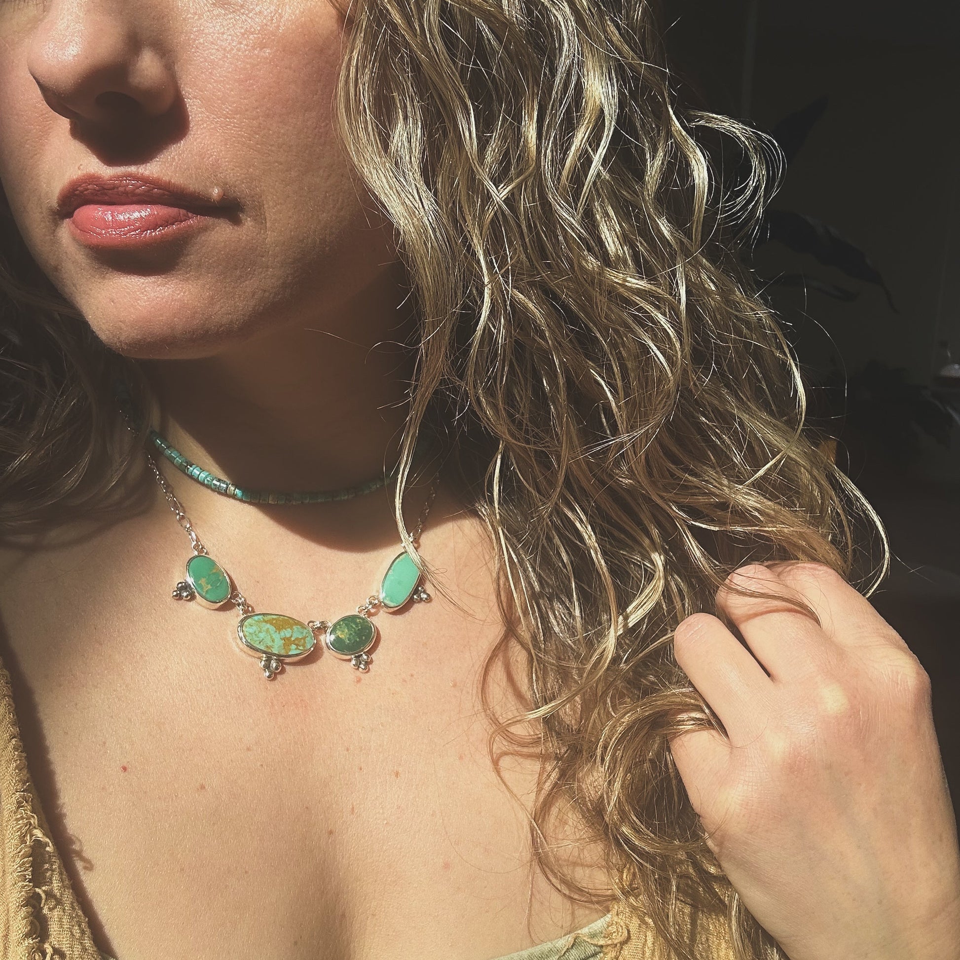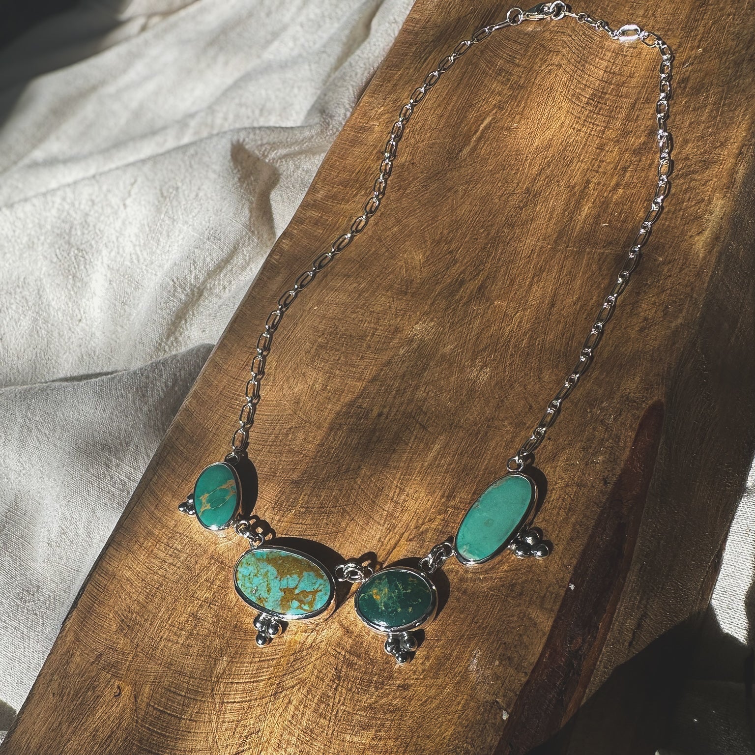 Earthy and botanical, like a row of stones blooming across the collarbone. Sterling silver necklace with a row of natural green mixed turquoise stones, each individually set and accented with subtle silver granulation. Set on a sterling silver, long & short linked chaing.